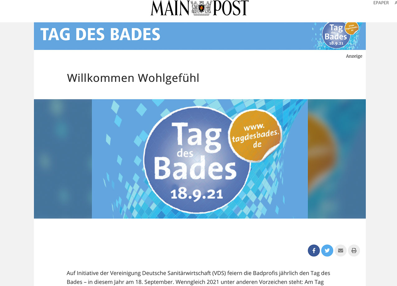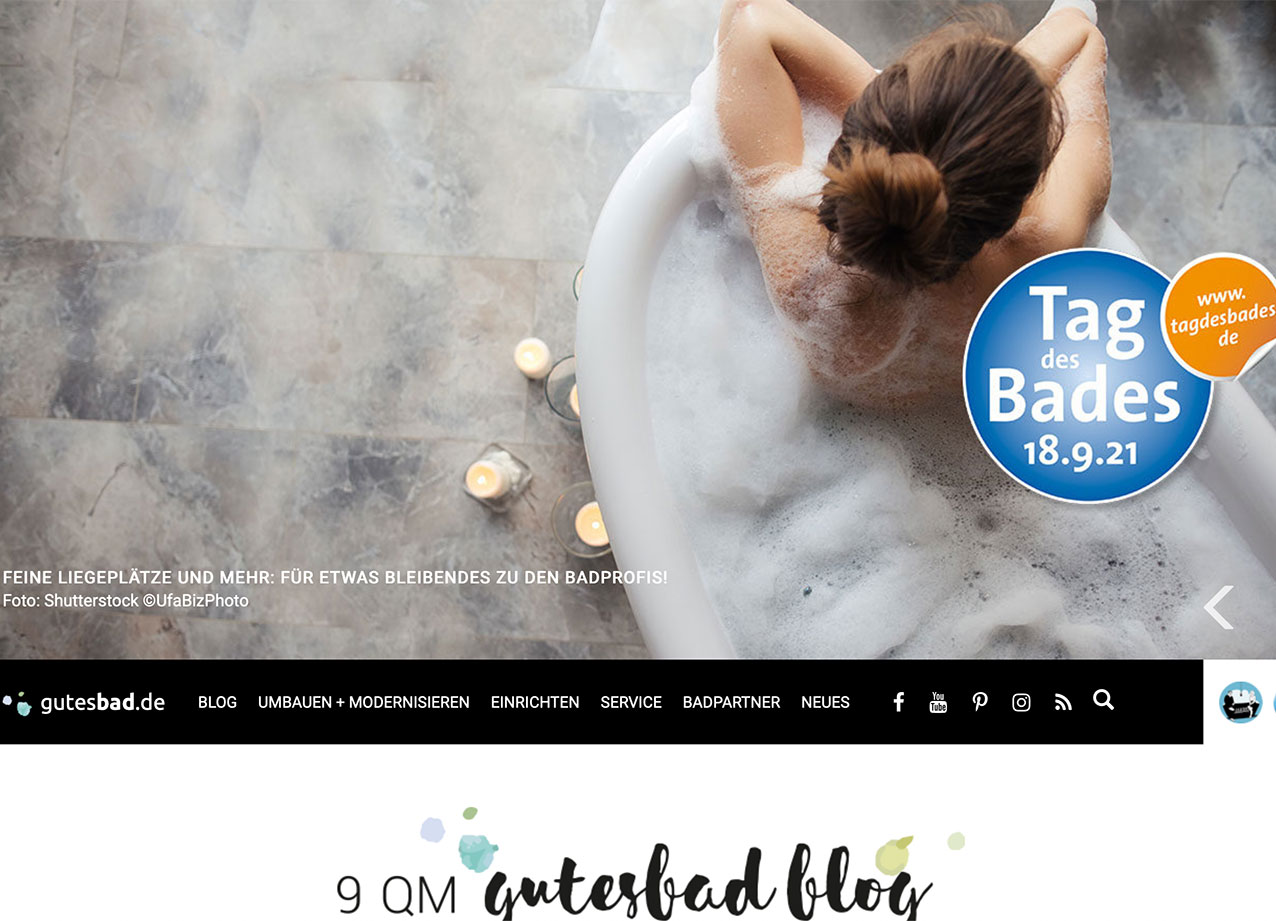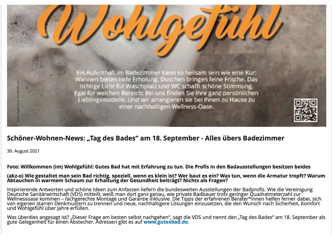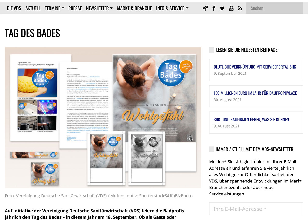 Weitere Mittel, um die Werbetrommel zu rühren: gezielte Streuung von Presseinformationen an Tages- und Anzeigenblätter sowie die Fortführung der Kooperation mit dem Fachschriften Verlag. Darüber hinaus gab es zahlreiche redaktionelle Beiträge mit den Schwerpunkten Wohlgefühl und Nachhaltigkeit. Die Aufmacher der VDS-Onlineangebote verwiesen zudem in verschiedenen Varianten auf den Tag des Bades 2021. Hinzu kamen Social-Media-Posts auf Facebook, Instagram und Twitter. Darüber hinaus nahm sich im Vorfeld die Fachpresse des Themas in Wort und Bild an. Nochmals ein herzliches Dankeschön an alle!