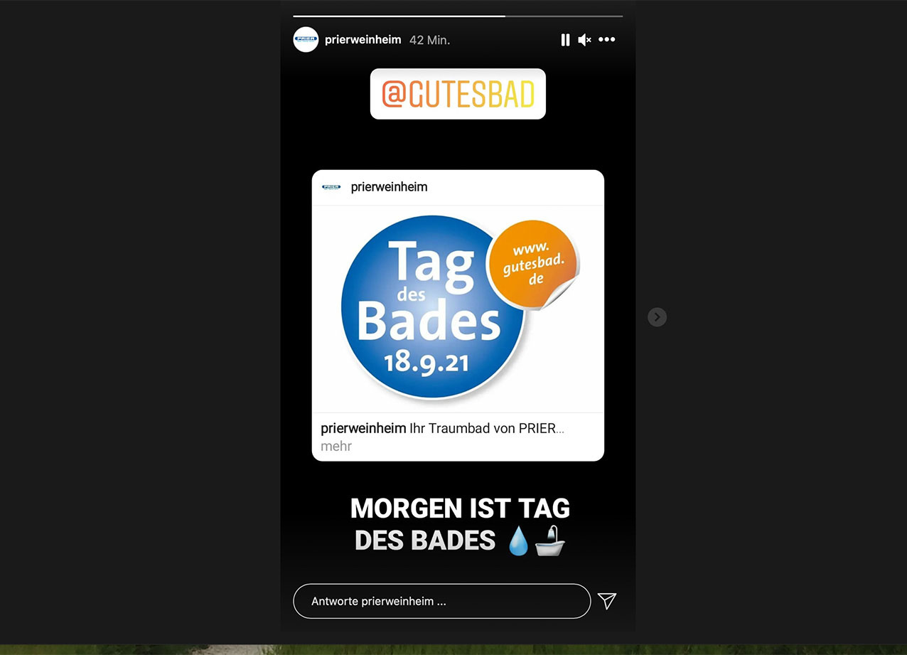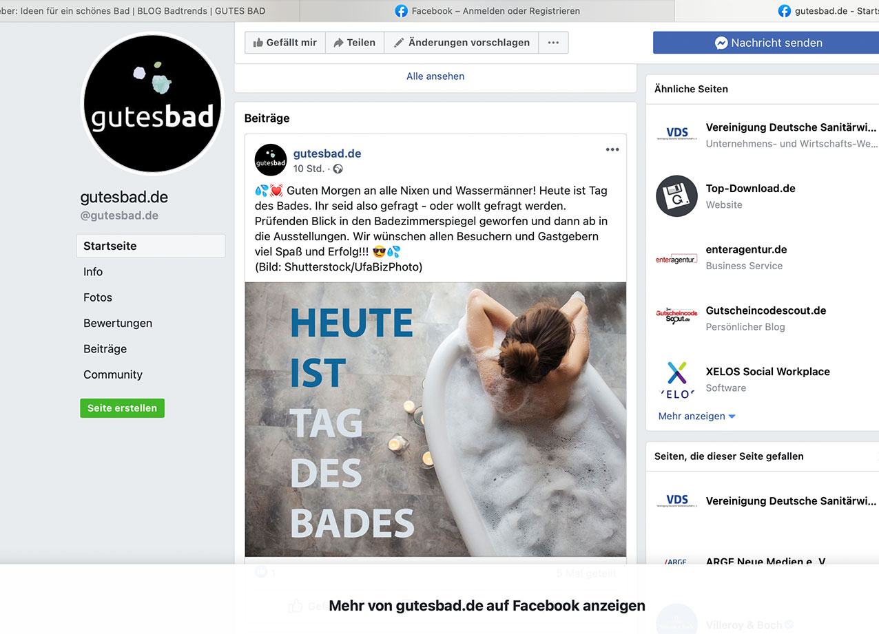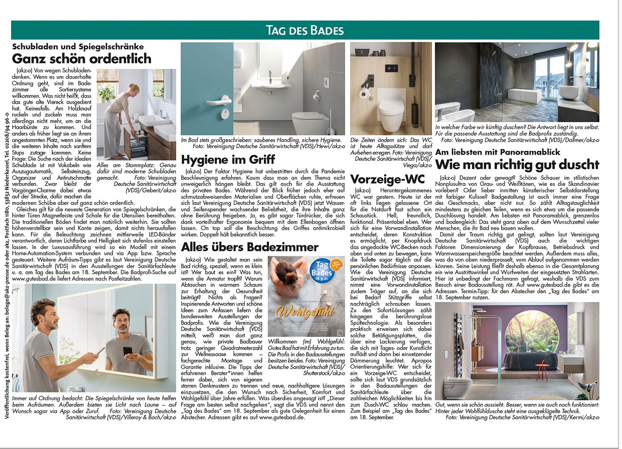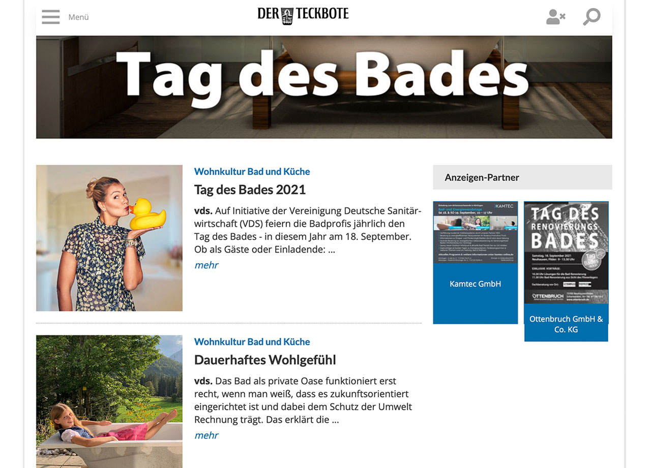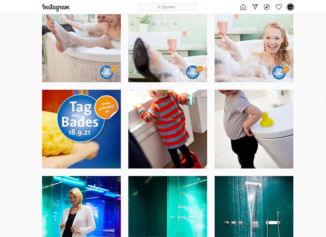 Weitere Mittel, um die Werbetrommel zu rühren: gezielte Streuung von Presseinformationen an Tages- und Anzeigenblätter sowie die Fortführung der Kooperation mit dem Fachschriften Verlag. Darüber hinaus gab es zahlreiche redaktionelle Beiträge mit den Schwerpunkten Wohlgefühl und Nachhaltigkeit. Die Aufmacher der VDS-Onlineangebote verwiesen zudem in verschiedenen Varianten auf den Tag des Bades 2021. Hinzu kamen Social-Media-Posts auf Facebook, Instagram und Twitter. Darüber hinaus nahm sich im Vorfeld die Fachpresse des Themas in Wort und Bild an. Nochmals ein herzliches Dankeschön an alle!