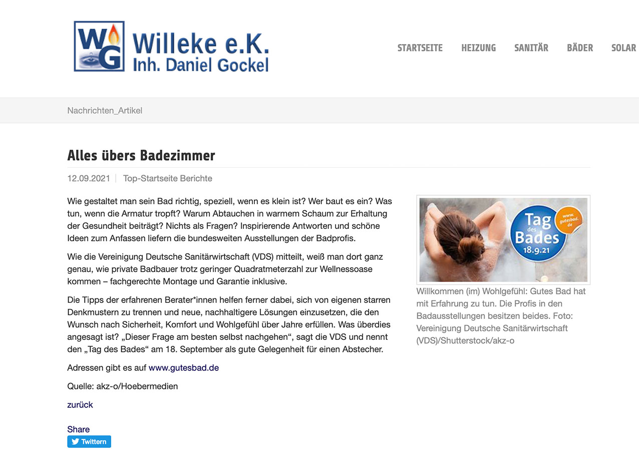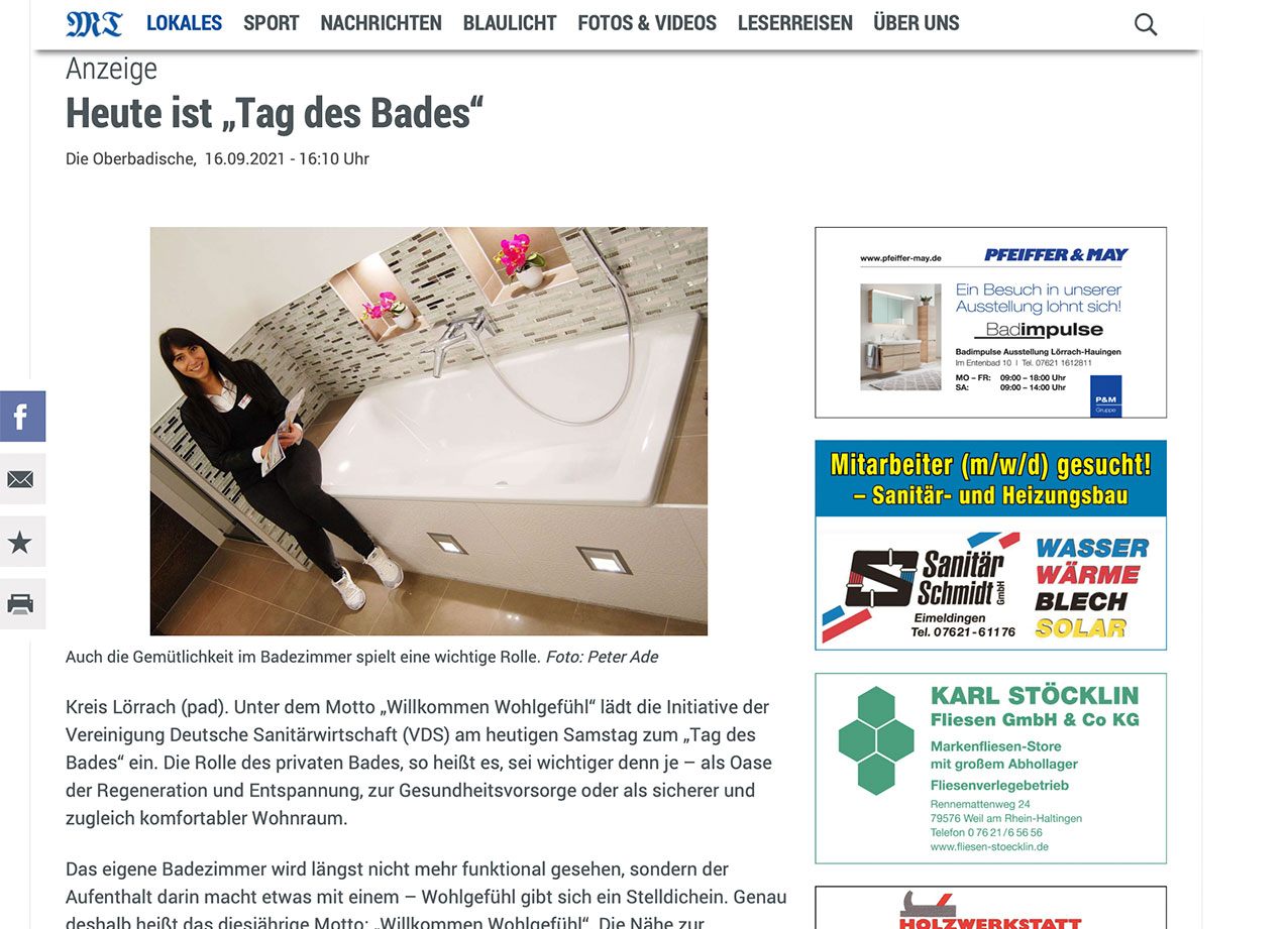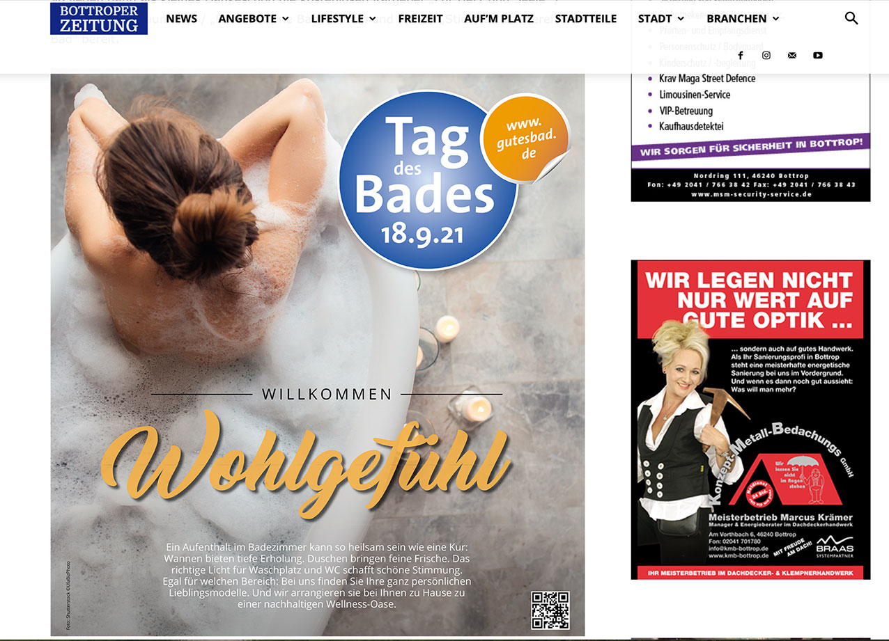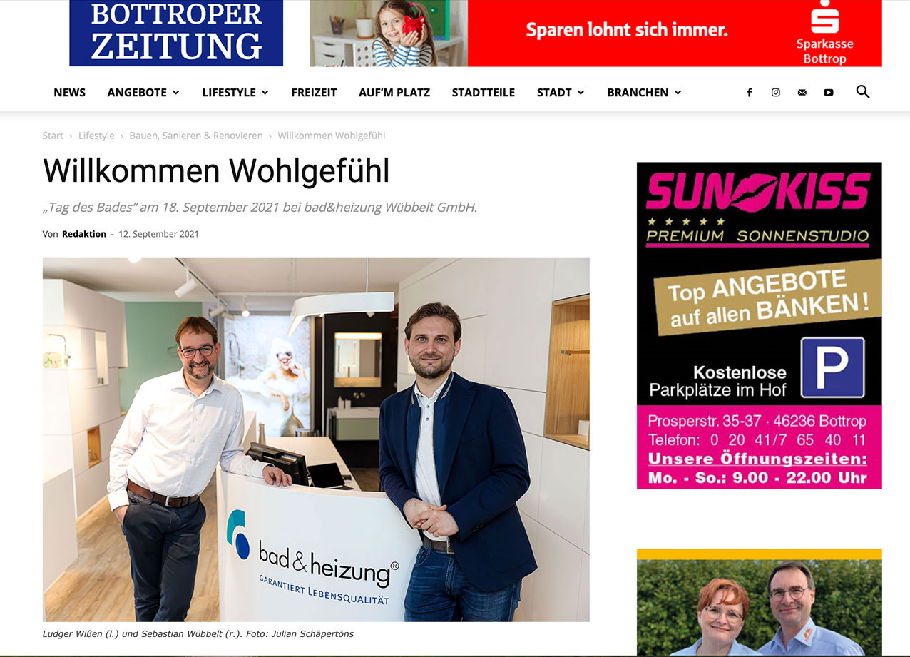 Ein besonders schönes Beispiel, wie sich die Aktionsmittel nutzen lassen, entdeckten wir in der Bottroper Zeitung, die im Vorfeld des Tag des Bades über die bad&heizung Wübbelt GmbH berichtete. Für alle Nachahmer: https://bottroper-zeitung.de/willkommen-wohlgefuehl/